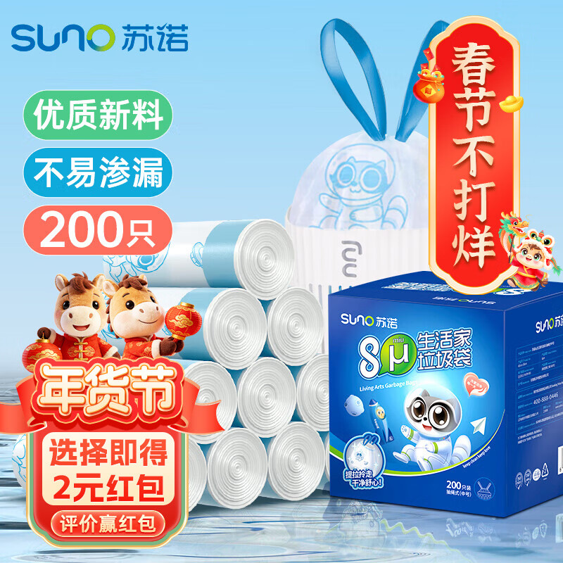 苏诺抽绳式垃圾袋印花45*50cm*200只单面0.8丝全新料防刺破家用办公