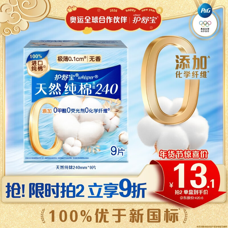 护舒宝天然纯棉卫生巾日用240mm9片姨妈巾超薄透气试用京东自营官方旗舰