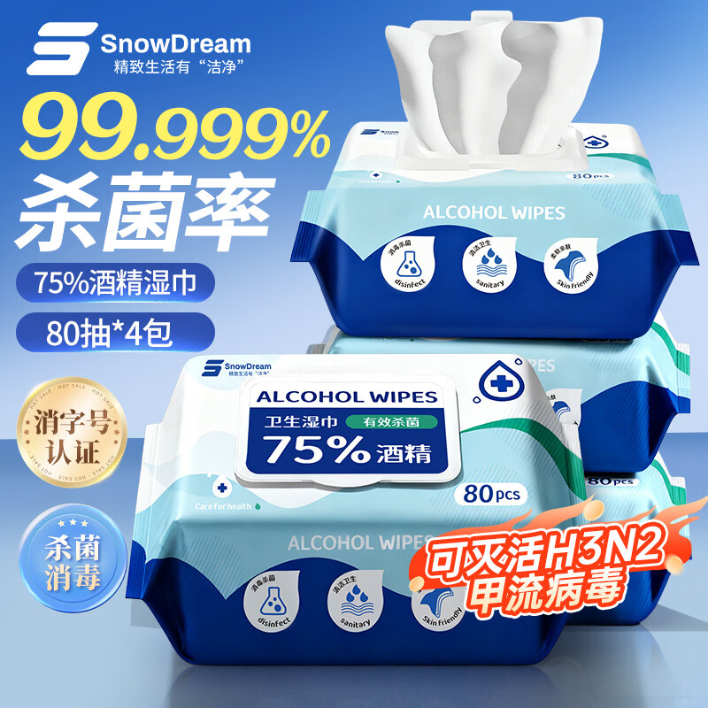 SnowDream75%酒精湿巾 80抽*4包 杀菌率99.999% 加大加厚杀菌消毒