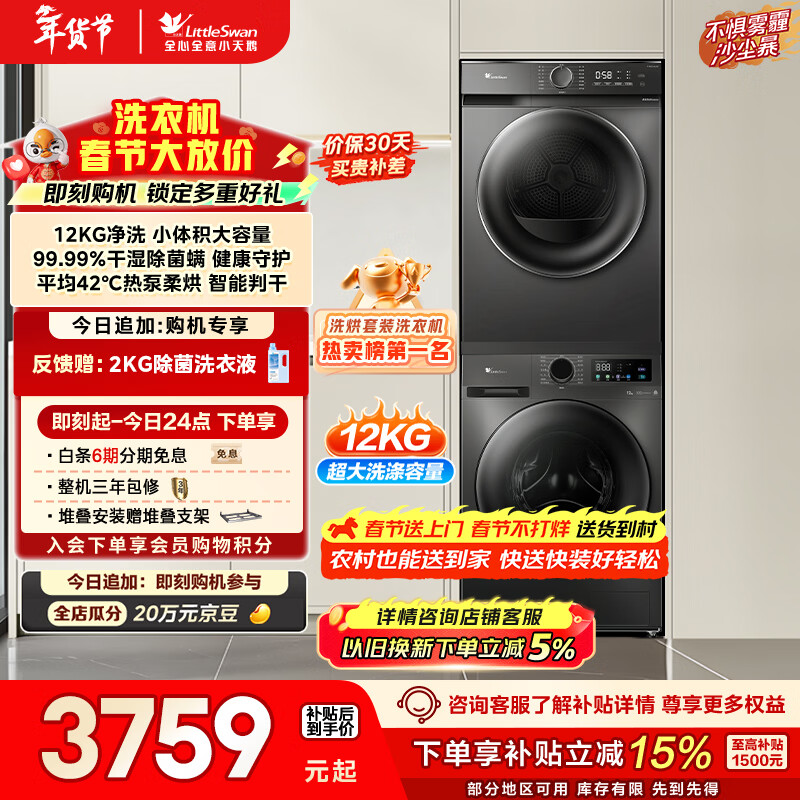 小天鹅(LittleSwan)洗烘套装 12KG大容量 滚筒洗衣机全自动+热泵烘干机 除菌除螨 TG120V098WDT+02T以旧换新 国家补贴
