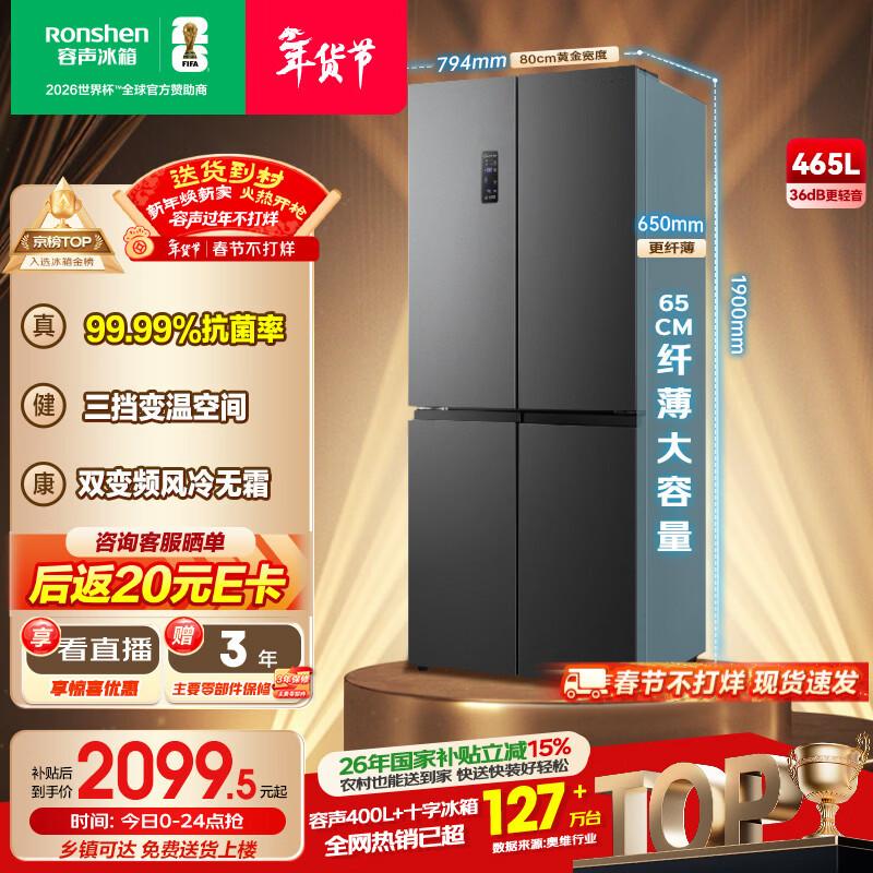 容声465升十字双开四开门电冰箱家用一级能效风冷无霜变频节能超薄大容量 BCD-465WD18FP家电国家补贴