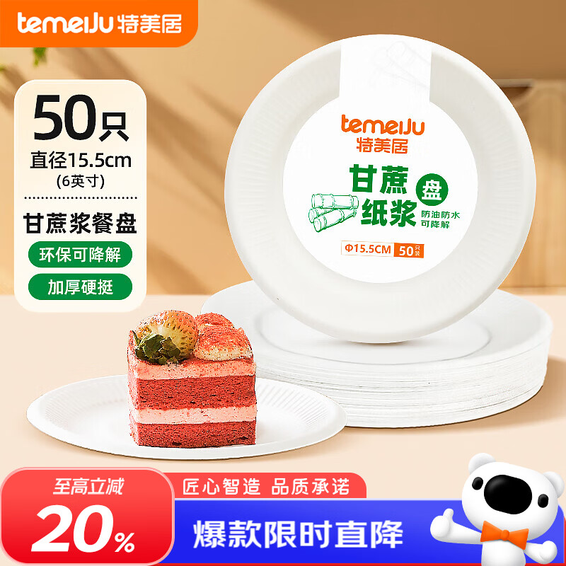 特美居(temeiju)6英寸一次性盘子蛋糕纸盘碟可降解餐盘户外野餐盘餐具50只15.5cm