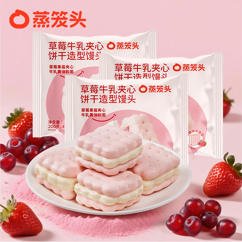 蒸笼头草莓饼干造型牛乳馒头200g4只*3袋 共600g12只 儿童营养速食早餐