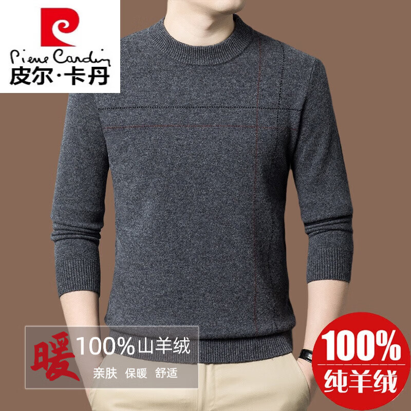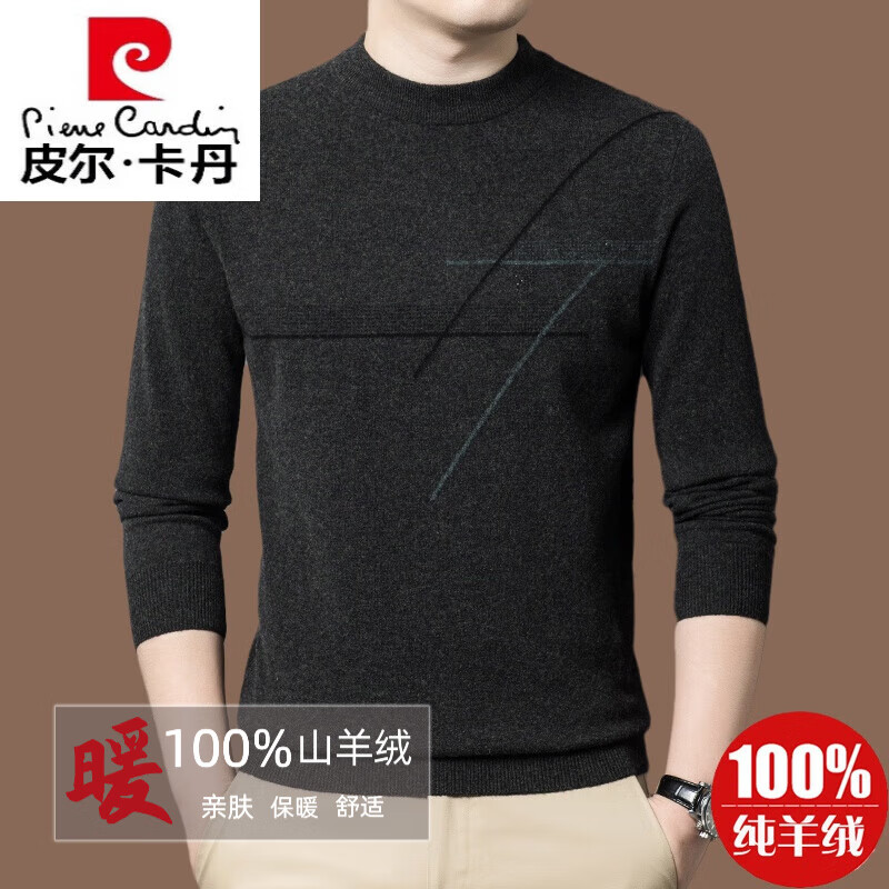 皮尔卡丹【名牌】100%纯羊绒毛衣男加厚秋冬男士羊绒衫内搭打底衫针织 深灰【润28067】 185/3XL【适合体重175-195斤】