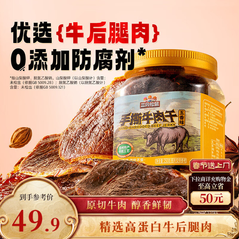 三只松鼠手撕牛肉片五香味250g罐装休闲零食牛肉干即食卤香烘烤