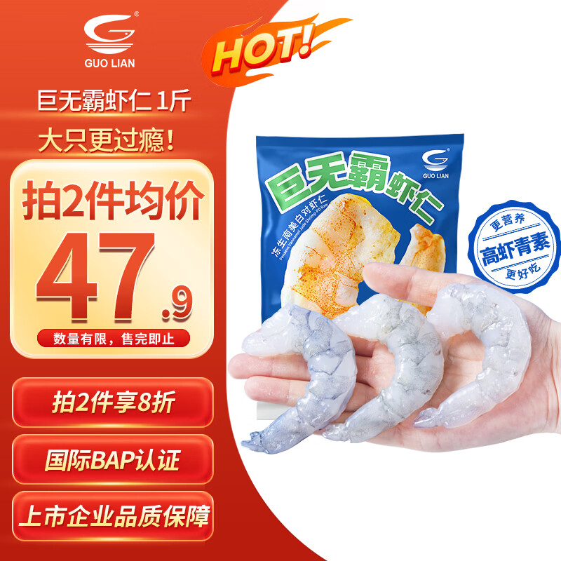 GUO LIAN国联水产 翡翠生虾仁特大号 净重1斤17-22只 京东虾仁品质保障