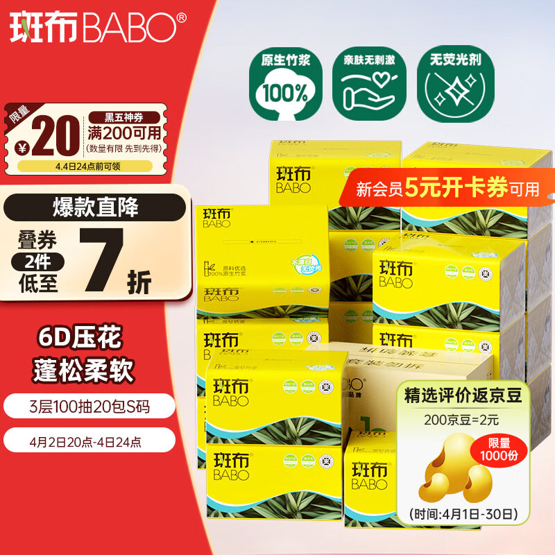 斑布抽纸 3层100抽*20包S码 6D压花蓬松柔软本色纸 纸巾餐巾纸 卫生纸