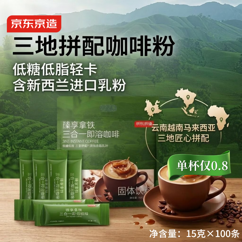 京东京造0植脂末低糖奶香拿铁 咖啡速溶三合一100条1500g 咖啡粉冲调