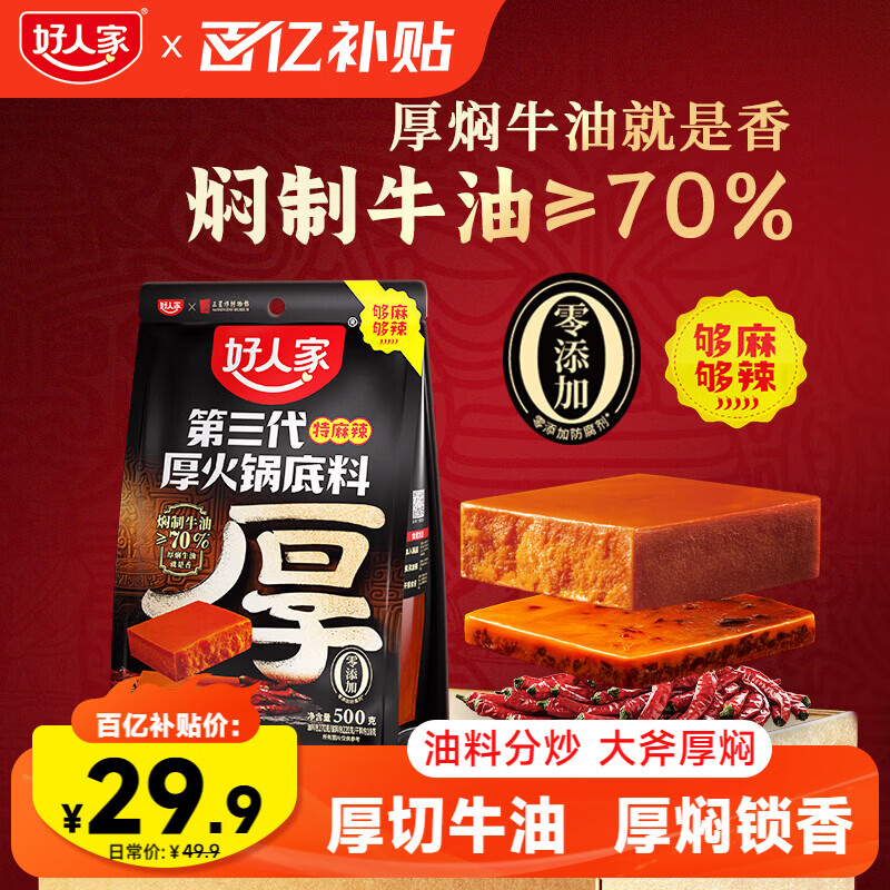 好人家第三代厚火锅底料特麻辣500g 牛油加麻加辣香锅调料