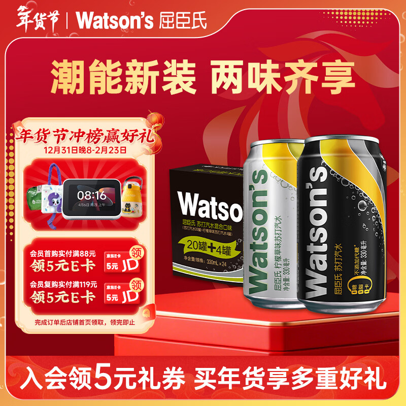 屈臣氏(Watsons)苏打汽水混合气泡饮料330mL*24罐(原味20罐+柠檬草4罐)年货送礼