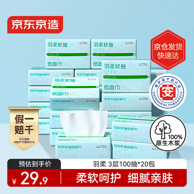 京东京造羽柔纸巾100抽*20包 3层无香纸巾面巾纸餐巾纸 整箱抽纸京东自营