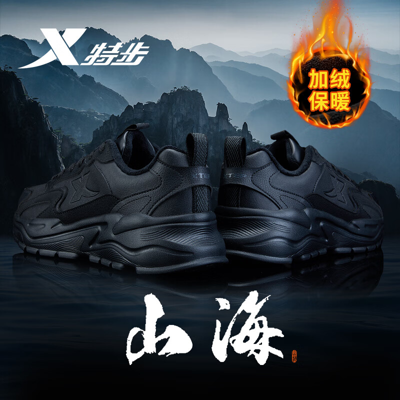 特步男鞋秋冬季运动鞋子男款青少年厚底增高防水老爹鞋山海系列休闲鞋 黑0051【保暖加绒】 45