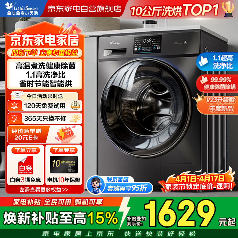 小天鹅洗衣机洗烘一体机滚筒全自动带烘干10公斤洗烘一体家用 带烘干 高温除菌除螨以旧换新TD100V23PRO