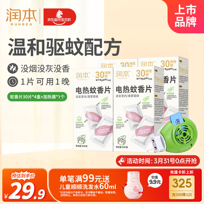 润本蚊香电蚊香蚊香片30片*4盒+1个蚊香加热器驱蚊防蚊驱蚊器无香型