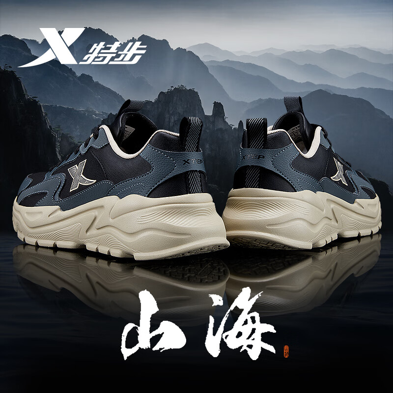 特步男鞋秋冬季运动鞋子男款青少年厚底增高防水老爹鞋山海系列休闲鞋 木炭灰0051【防水皮面】 44