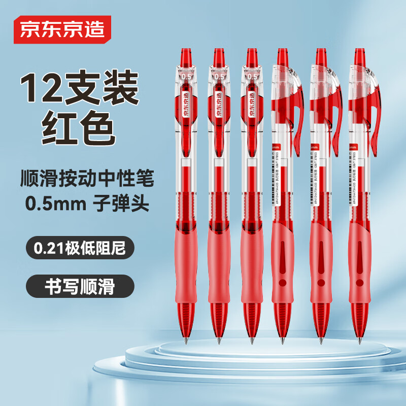 京东京造【热门商品】顺滑按动中性笔 低阻尼速干签字笔水笔 商务办公学生刷题 0.5 红色12支装JD1011