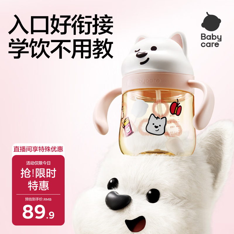 babycare西高地学饮杯鸭嘴吸管牛奶杯宝宝6个月奶瓶儿童学生水杯-欧泊粉