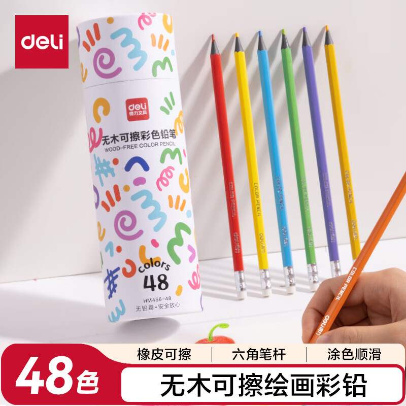 得力(deli)48色六角杆皮头可擦彩铅作业涂色美术绘画儿童涂鸦手绘易洗可擦女孩儿童礼物HM456-48彩笔
