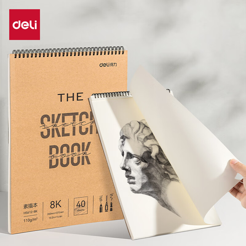 得力(deli)8K牛皮素描本110g/40页素描纸绘画涂鸦易上铅画画礼物美术专用速写本竖翻初学临摹 HS612-8K