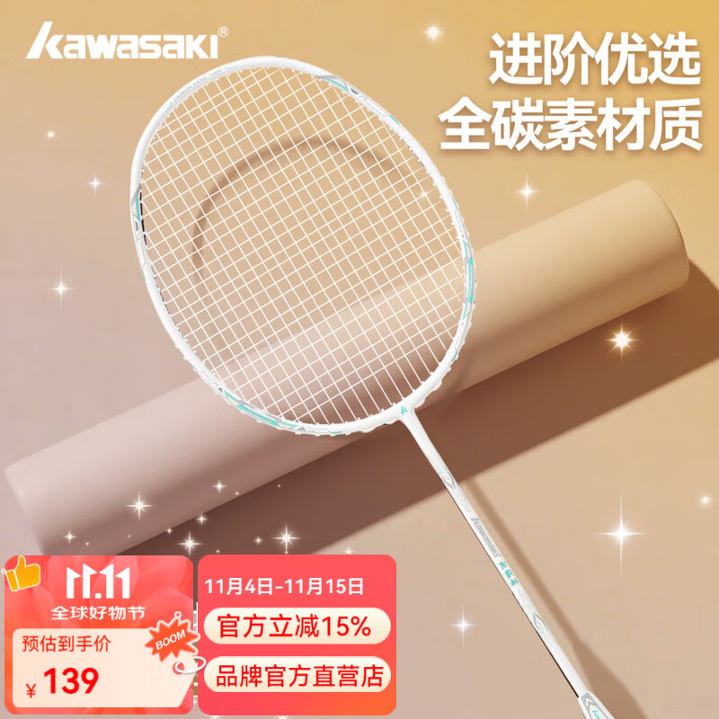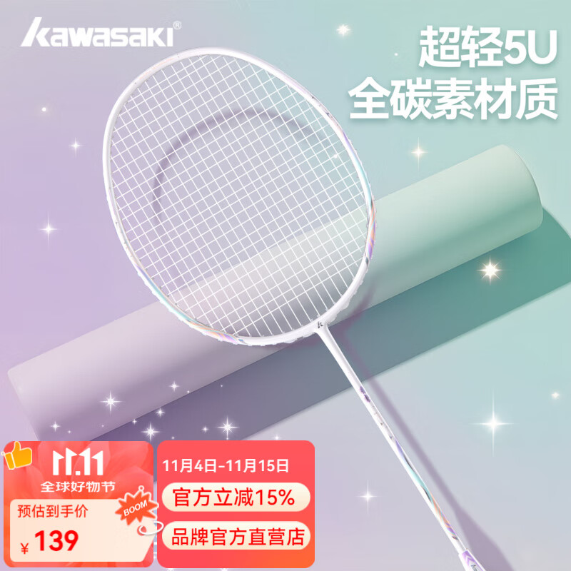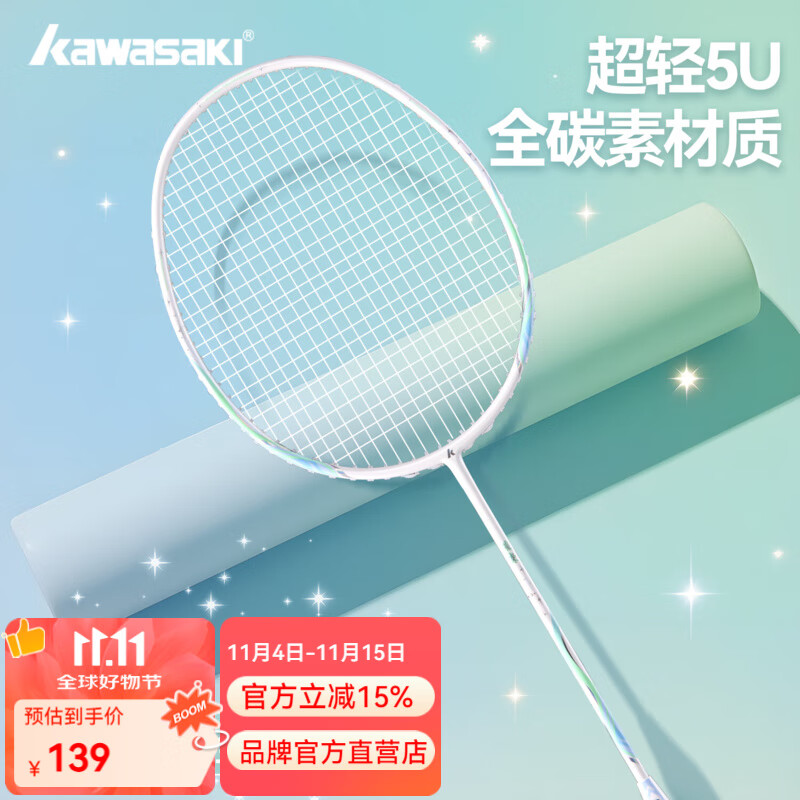 川崎(KAWASAKI) 羽毛球球拍单拍男女专业全碳素超轻进攻型羽毛拍单支羽毛球拍 送3球2手胶-璀璨 (穿线) 淡蓝