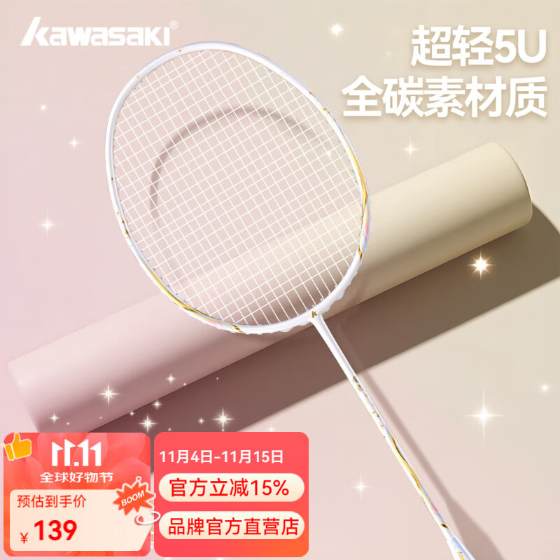 川崎(KAWASAKI) 羽毛球球拍单拍男女专业全碳素超轻进攻型羽毛拍单支羽毛球拍 送3球2手胶-璀璨 (穿线) 淡金