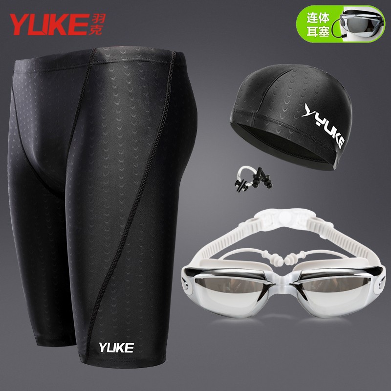 羽克(Yuke)泳裤男五分速干游泳裤男士防水泳衣游泳装备仿鲨鱼皮泳帽泳镜套装 四件套银色电镀 L码(适合90-100斤)