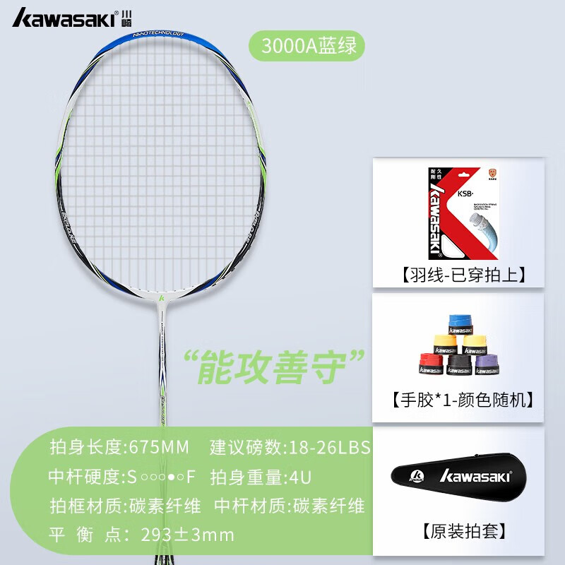 川崎(KAWASAKI) 羽毛球球拍单拍男女专业全碳素超轻进攻型羽毛拍单支羽毛球拍 【3000A 全碳素单拍】蓝绿色