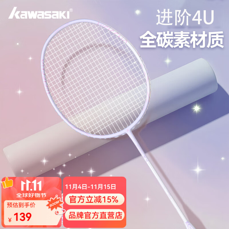 川崎(KAWASAKI) 羽毛球球拍单拍男女专业全碳素超轻进攻型羽毛拍单支羽毛球拍 送3球2手胶-微风 暮山紫(穿线)