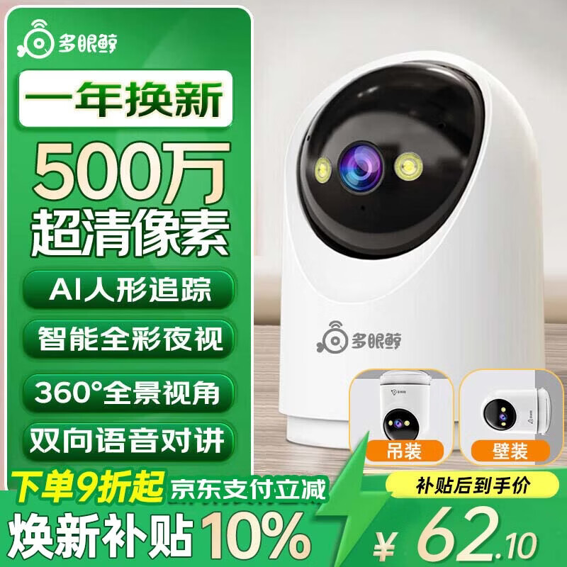 多眼鲸500万超清AI摄像头家用高清监控器360度无死角带夜视全景语音手机远程旋转可对话室内外家庭云台