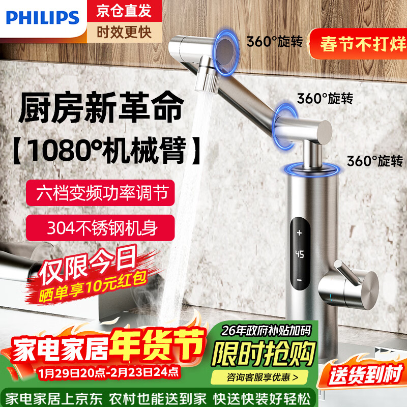 飞利浦即热式电热水龙头机械臂速热变频恒温不锈钢冷热厨房卫生间家用屏显电热水器小厨宝包安装2105 【新款上新】六档变频不锈钢机械臂