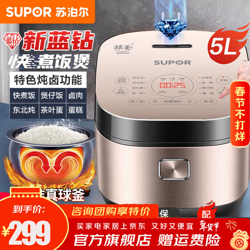 苏泊尔(SUPOR)电饭煲微压电饭锅5升大容量家用5L球釜4-5人-10人多功能一体智能预约柴火饭 【SF50FC873】 5L