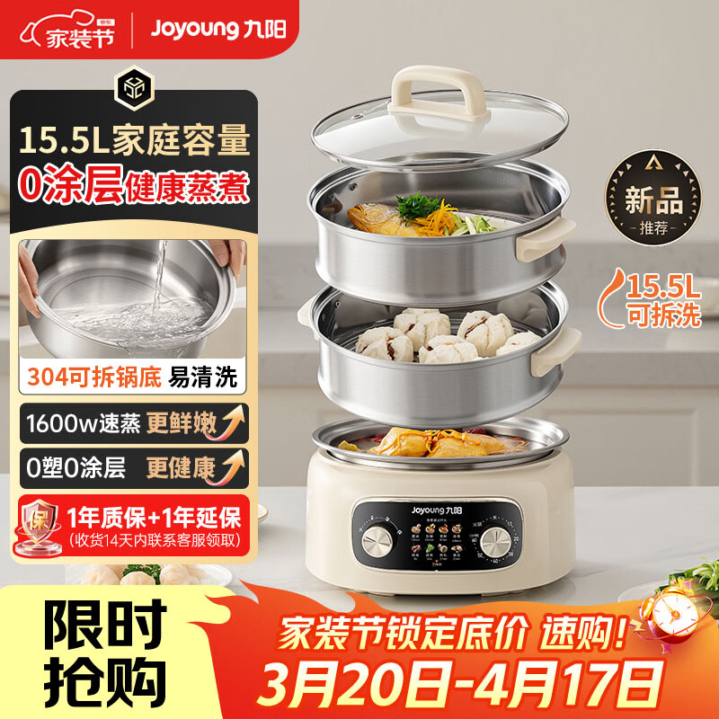 九阳(Joyoung)电蒸锅电煮锅电火锅304不锈钢锅全钢0塑0涂层家用三层15.5L大容量可拆内胆上蒸下煮GZ561
