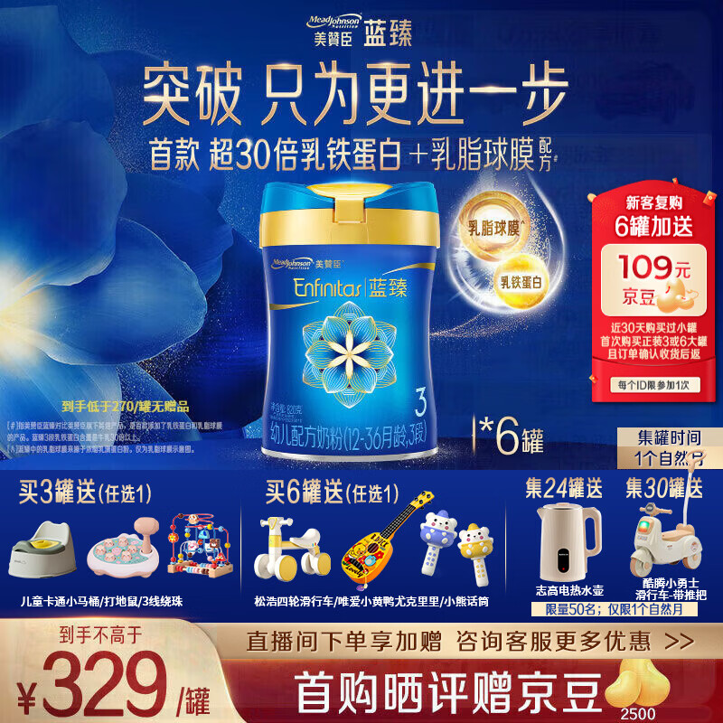 美赞臣官方店蓝臻新国标3段婴幼儿(1-3岁)奶粉荷兰进口含乳铁蛋白礼盒 蓝臻3段820g新国标*6罐 咨询领券更优惠