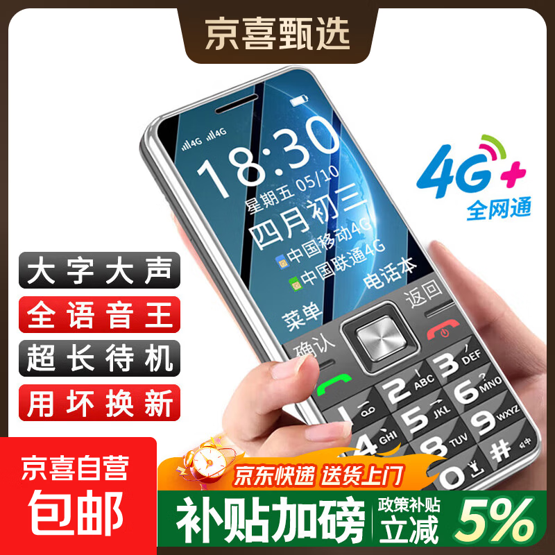 老年人手机国家补贴 4G全网通超长待机直板按键 大字大声音大屏大按键 学生专用商务备用功能机 黑色【全网通】+充电器