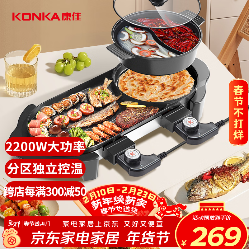 康佳(KONKA)烤肉锅电烤盘 烤涮一体两用锅家用火锅多功能电烤炉烧烤炉无烟不粘可拆洗 【升级 特大款】涮烤一体 | 6-10人 1层
