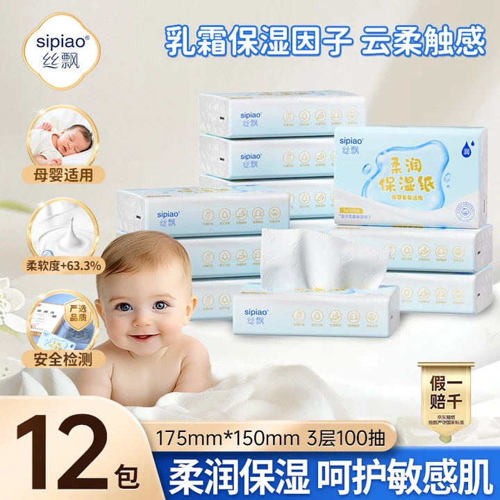 丝飘(SIPIAO)乳霜纸3层100抽12包婴儿纸巾 云柔巾儿童宝宝抽纸鼻炎擦鼻涕