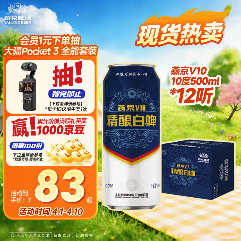 燕京啤酒 V10白啤10°P精酿啤酒500ml*12听 整箱装 春日热卖踏春送礼