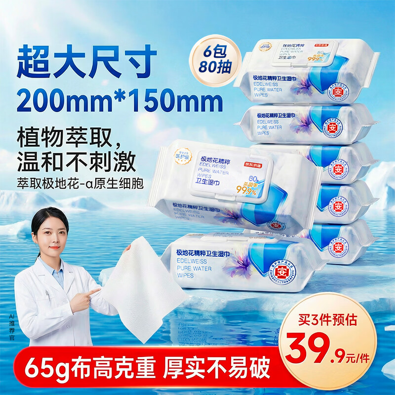 京东京造极地花杀菌湿巾80片*6包 99.9%杀菌卫生湿纸巾 加大加厚医护级