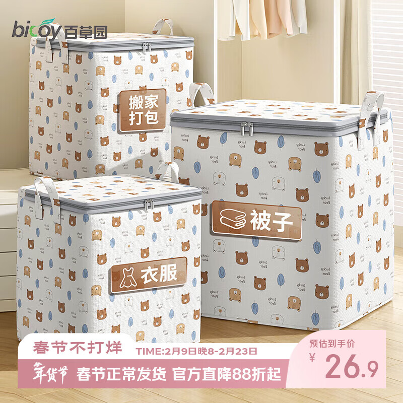 百草园衣服棉被子收纳袋搬家打包整理装棉絮的储物袋防尘防潮拉链款100L