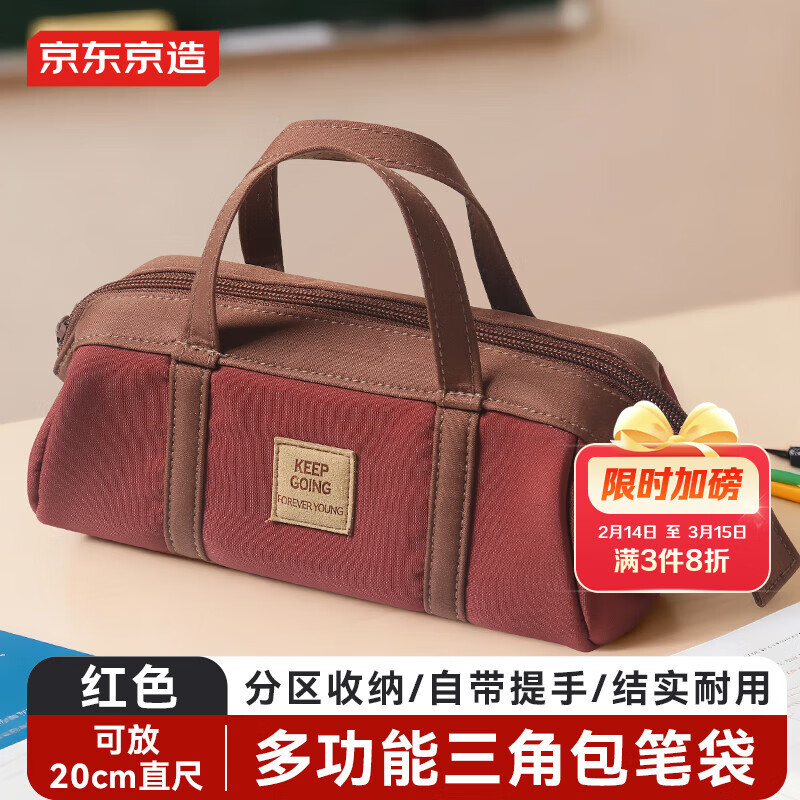 京东京造 多功能学生笔袋 文具铅笔收纳盒 开学必备 带手提大开口笔袋 红色 JD5051