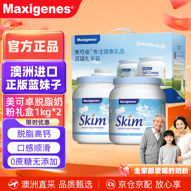 Maxigenes美可卓正品蓝胖子脱脂牛奶粉高钙低脂过年送礼春节礼盒装1kg*2罐