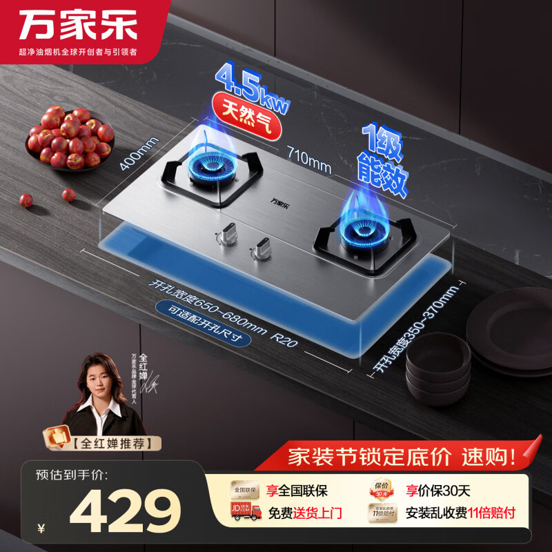 万家乐燃气灶【双高火KA032】立体全进风灶具4.5kW火力不锈钢面板天燃气灶台嵌两用家用猛火双灶天然气灶