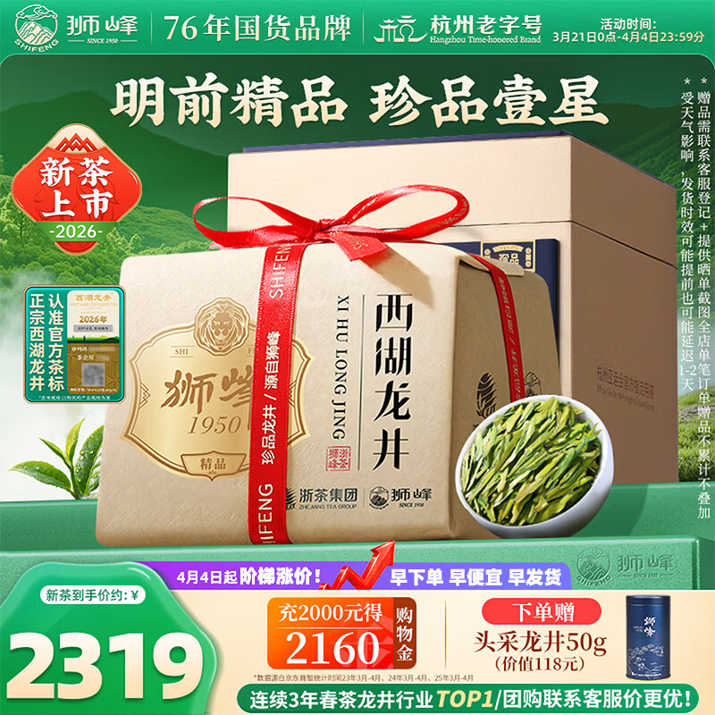 狮峰牌2026年新茶上市绿茶西湖龙井茶叶1星明前手工特级精品250g礼盒