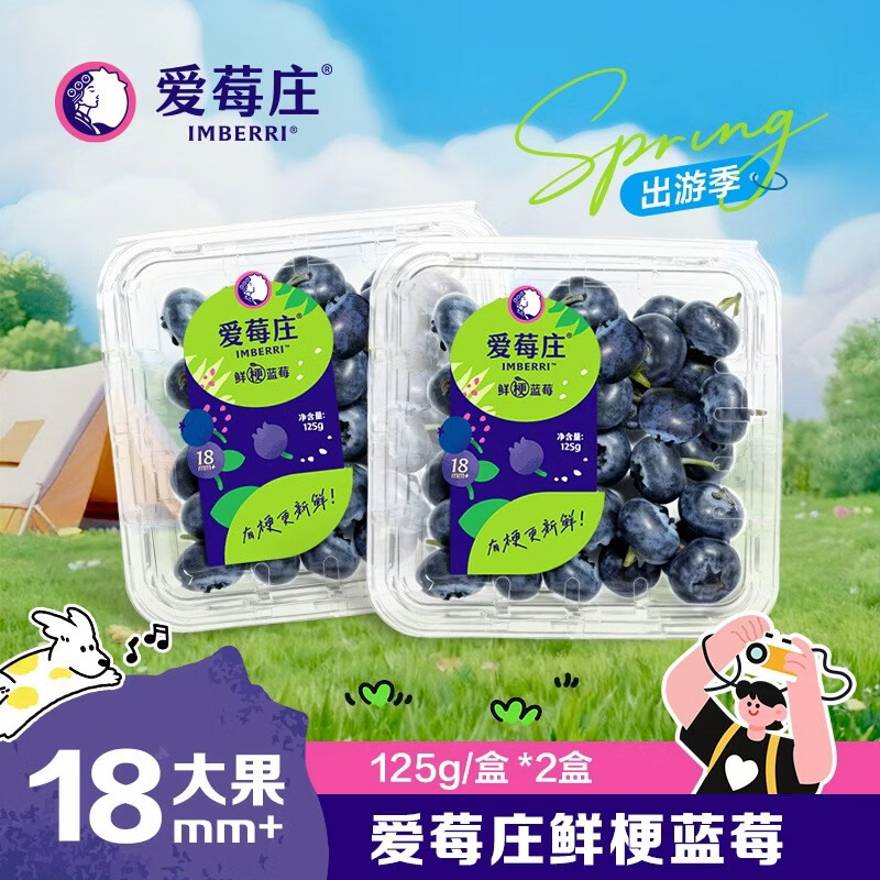 爱莓庄云南鲜梗蓝莓 脆甜新鲜人工采摘 18mm+2盒装 约125g/盒源头直发