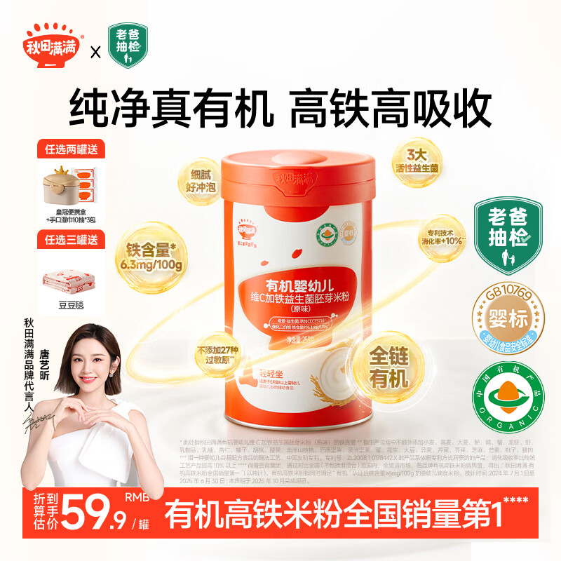 秋田满满婴儿有机高铁米粉258g原味6-12个月宝宝营养辅食维C加铁米糊 6月+