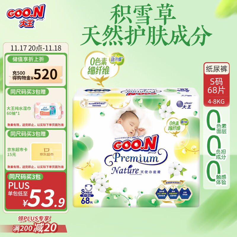 大王【品牌直供 安心品质】天使自然之恩纸尿裤 S68片(4-8kg)尿不湿
