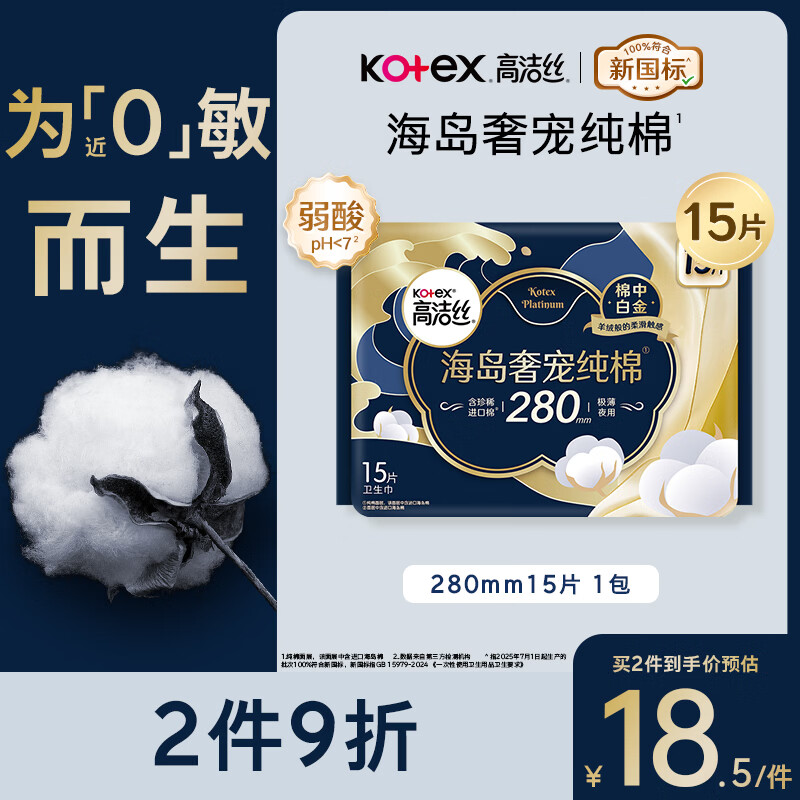 高洁丝【近0敏海岛棉】奢宠纯棉卫生巾280mm15片日用姨妈巾京东自营旗舰