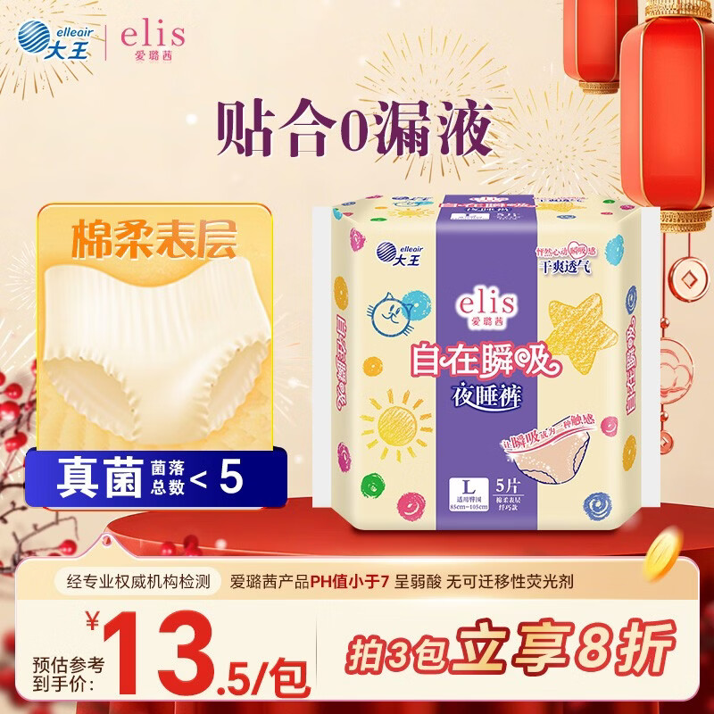 爱璐茜(elis)大王自在瞬吸安睡裤L码5条超薄夜用裤型卫生巾姨妈拉拉裤京东自营