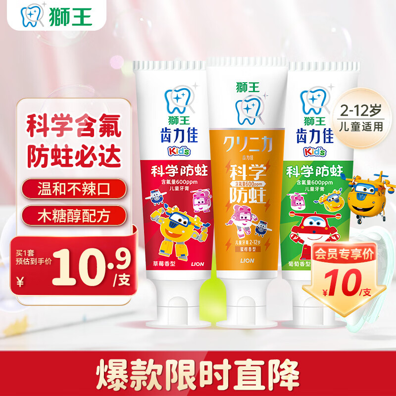 狮王(Lion)齿力佳儿童科学防蛀牙膏2-12岁150g草莓+葡萄+蜜柑新老包装随机