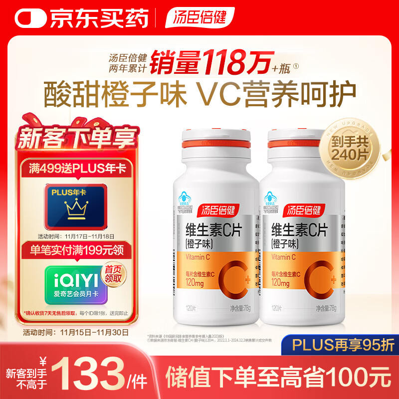 汤臣倍健 维生素c橙子味240片成人男士女士补充vc咀嚼片非泡腾片